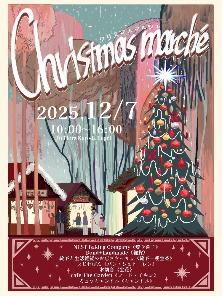 日時:12月7日(日)10:00~16:00場所:フローラ黒田園芸売り場内出店者さま:NEST Baking Company【焼き菓子】 Bond+handmade【雑貨】 靴下と生活雑貨のお店さきっちょ【靴下+養生茶】 にじわぱん【パン・シュトーレン】 木胡音【生花】 cafe The Garden【フード・チキン】 ミュゲキャンドル【キャンドル】